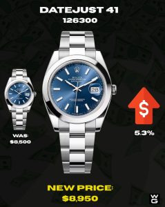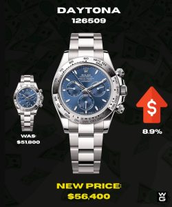 A white-gold Day-Date 228239 jumped by a staggering 8.6%, climbing thousands of dollars from $47,500 to $51,600!
