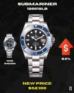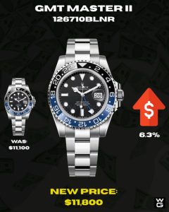 The GMT-Master II 126710BLNR “Batman” also rose by 6.3%, increasing from $11,100 to $11,800.
