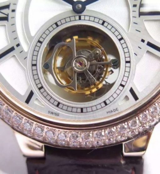 Replica Cartier Ballon Bleu Tourbillon RG Diamond Bezel Brown Leather Strap