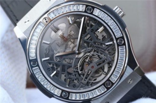Replica Hublot Classic Fusion Tourbillon 42mm TF Skeleton Dial Black Gummy Strap A23J