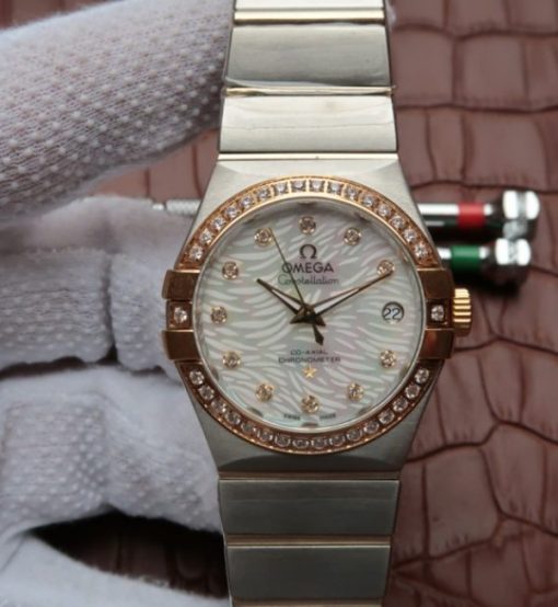 Replica Omega V6 Constellation 35mm SS White Dial Diamonds & Bezel Markers RG Bezel A2500