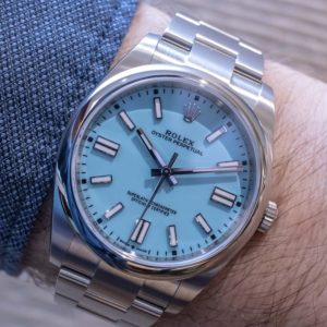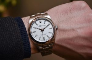 In 2016 Swiss Rolex copy watches launched the new Oyster Perpetual 39 ref. 114300 with grey, blue and grape dials, which I loved and still do. These were followed by models with black and white dials across the entire OP collection, including the 39mm models – the white dial immediately becoming a hit. A 39mm diameter is very flexible because it adapts to practically any wrist size but it still strays on the conservative side of the street.