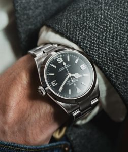 Before we get into the details of the design and case sizing, it’s worth briefly discussing the remarkable design constraints of the classic stainless steel Rolex Explorer. For starters, the model is defined by its signature time-only dial with prominent 3-6-9 Arabic numeral markers, which has only ever been black (unless you count the mega-rare “Albino” vintage models). Additionally, with a simple round case, a smooth bezel, and a flat three-link Oyster bracelet, there isn’t all that much that Rolex replica watches for sale can do to the Explorer from a design standpoint without fundamentally altering one of its most famous and recognizable models.